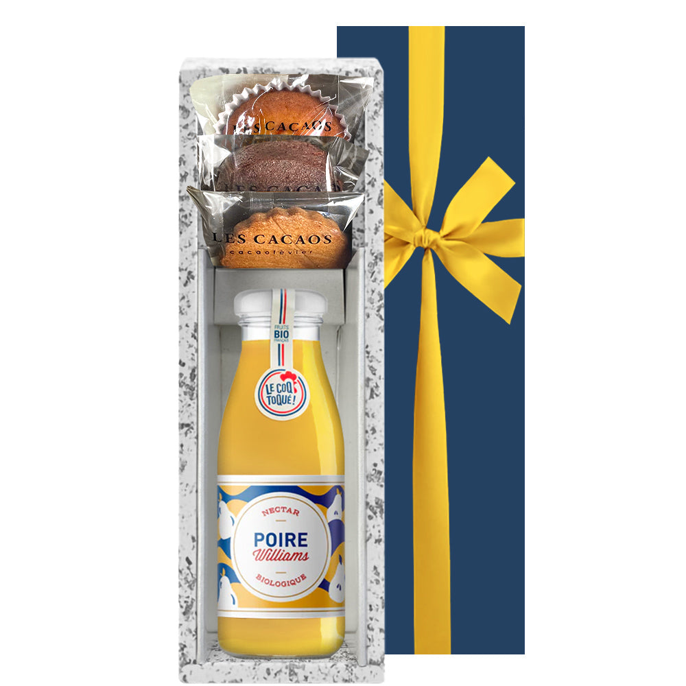 フランス産のオーガニック洋梨ネクターと、東京の有名パティスリー「LES CACAOS」の焼菓子詰め合わせのギフト。