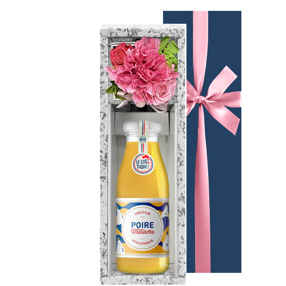 フランスの「ル・コック・トケ」によるオーガニックの洋梨のネクターと、カーネーションをモチーフにしたフラワーボックスのセット。