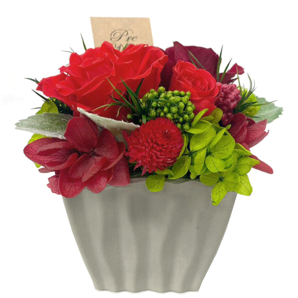 幅90mm×奥行き90mm×高さ115mmでフラワーベース付きで、そのまま飾れて、長く楽しめるのが魅力です。