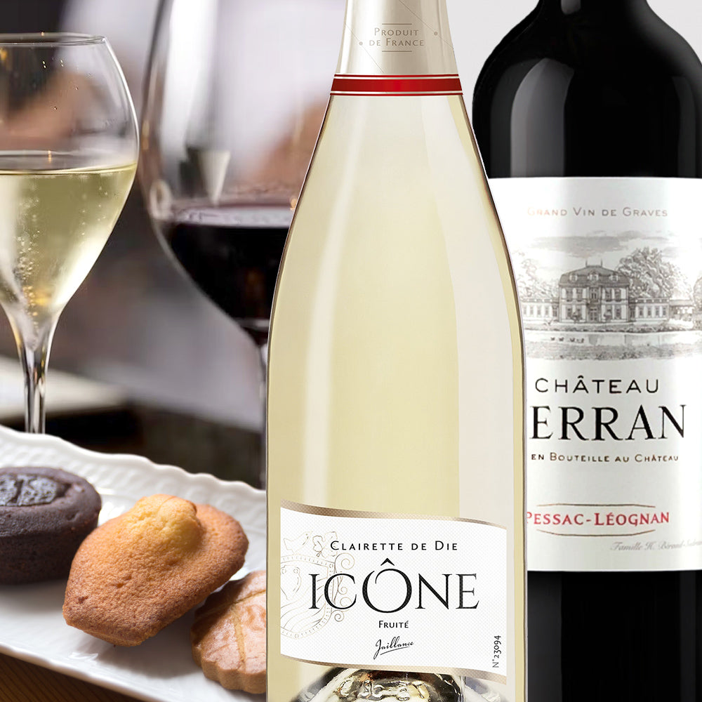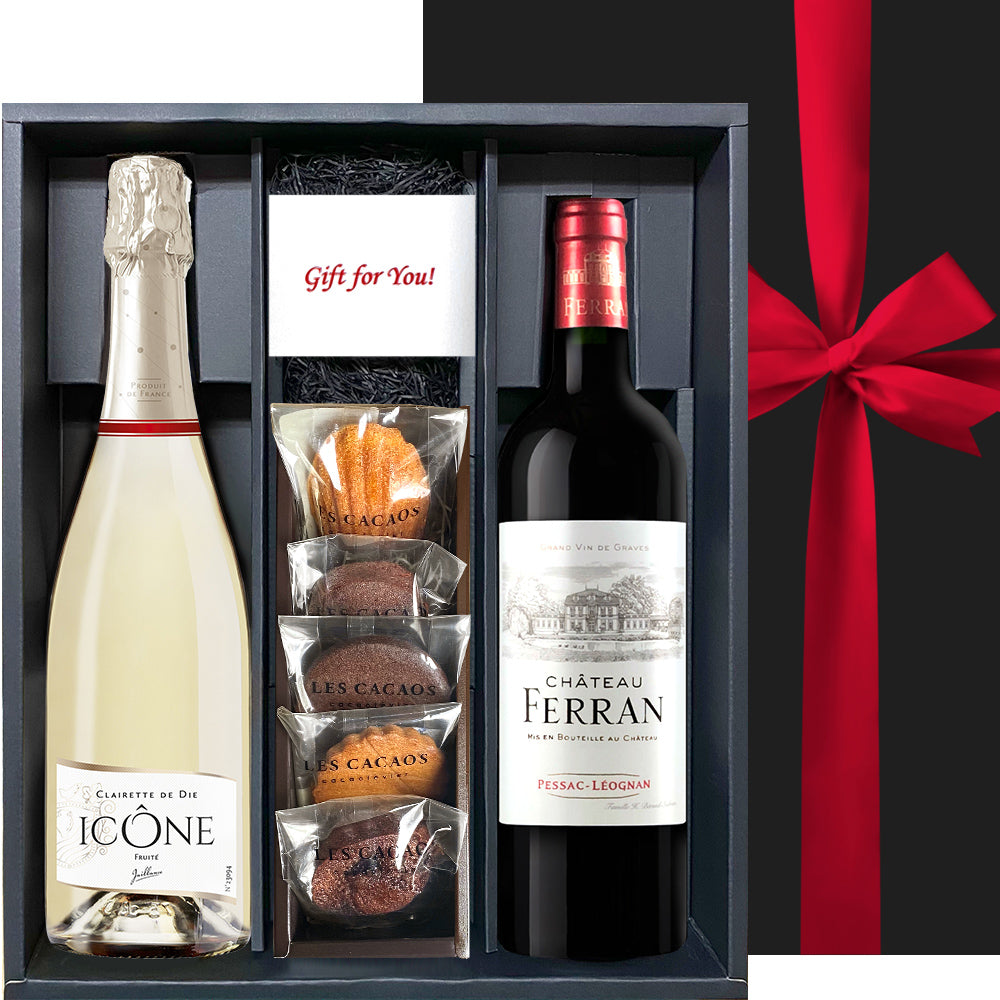 フランスのスパークリングと赤ワインに加え、おつまみに最適な鴨肉のテリーヌと、東京の人気店レ・カカオの焼き菓子のギフトセット。