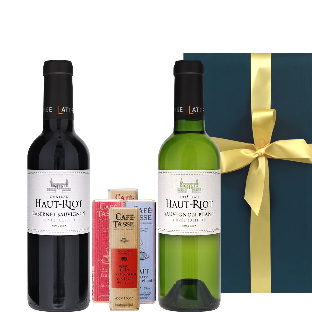 ハーフボトルサイズの白ワインと、ボルドーの赤ワイン、ベルギーチョコレートの詰め合わせです。